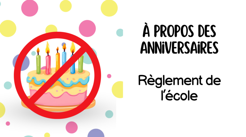 Conformément au règlement de l’école, il n’est pas permis d’apporter de gâteaux, biscuits ou autres gâteries en classe pour les anniversaires. L’organisation des activités pédagogiques ne s’y prête pas et la présence d’allergies alimentaires exige prudence.